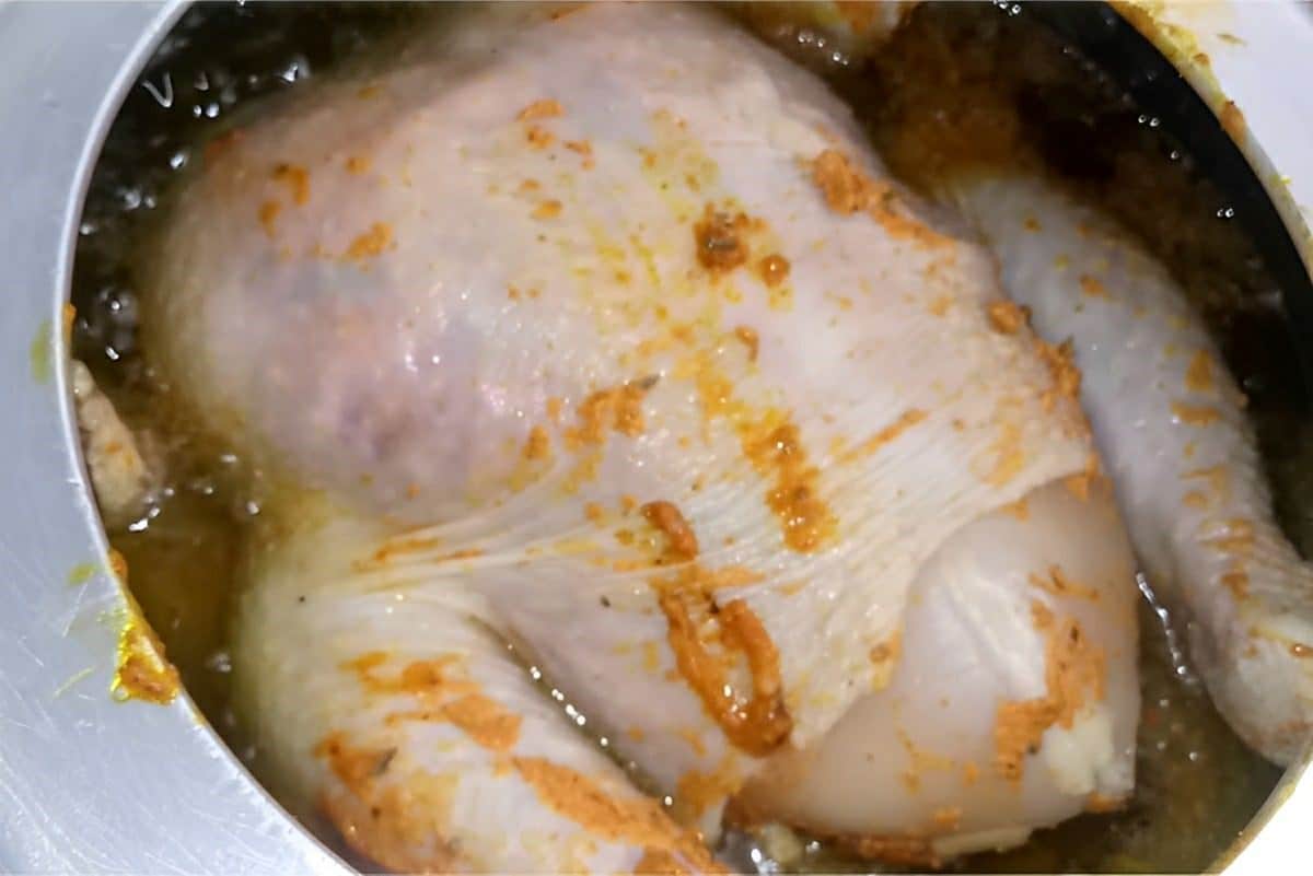 - No próximo dia, adicione o óleo na panela de pressão, aqueça muito bem e coloque o frango nesse óleo para fritar em fogo alto.