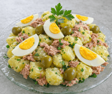 - Monte a Salada: Em uma travessa grande, misture as batatas cozidas com o atum desfiado (sem o líquido). Adicione as azeitonas e regue com o molho. Misture delicadamente para não desmanchar as batatas.