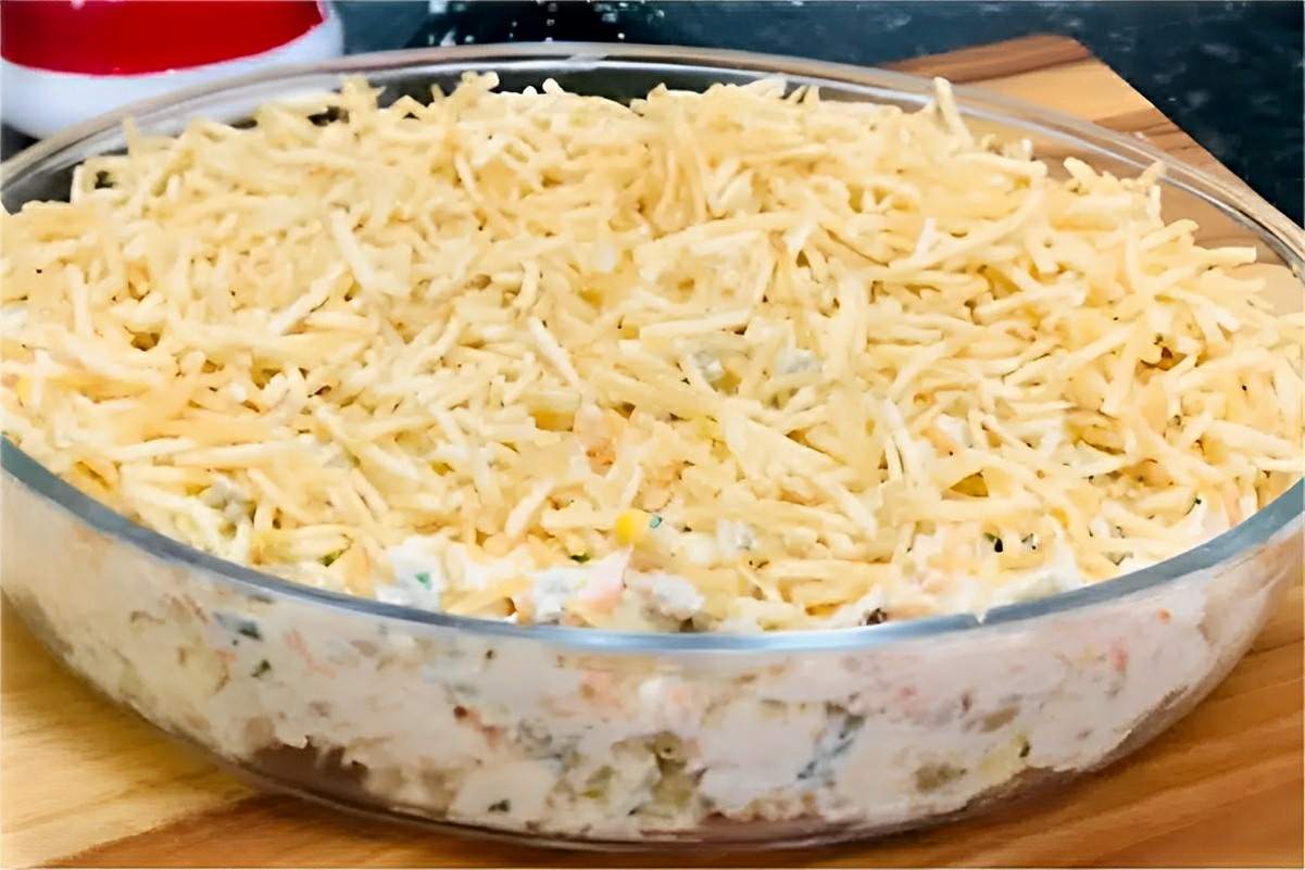 - Transfira o salpicão para um refratário de vidro e enfeite com a batata-palha.