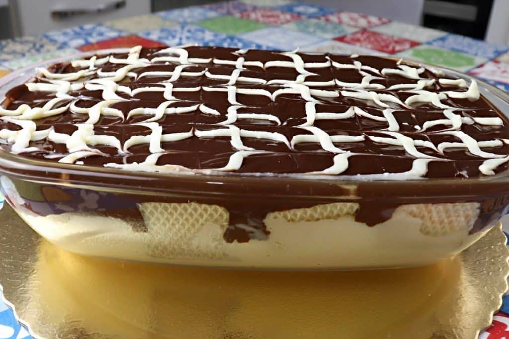 Sobremesa de Páscoa na travessa com creme branco ganache e wafer de chocolate uma delícia