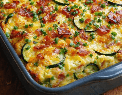- Em um refratário untado, coloque metade da massa, distribua as rodelas ou a abobrinha ralada e finalize cobrindo com o restante da massa.